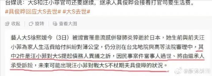据悉,大S与前夫汪小菲的官司还未结束。这场官司原定于2月27日开庭审理,然而大S的突然离世使得这一案件变得更加复杂。根据法律,大S的第一遗产继承人是她的现任丈夫具俊晔,因此具俊晔可能会代替大S继续打这场官司。这一消息引发了外界的广泛关注,许多人都在猜测具俊晔是否会继续这场官司,以及这场官司的最终结果会如何。